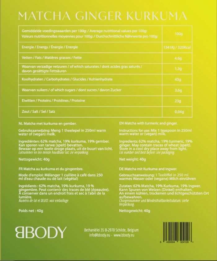 De Matcha Pumpkin Spice van BBODY combineert de rijke traditie van 37,5% Ceremonial Matcha met de natuurlijke zoetheid van 37,5% lucuma en de verwarmende kruidenmix van 25% pumpkin spice. Deze blend biedt niet alleen een unieke smaakervaring, maar ook een voedzame boost. Lucuma, bekend als het “Goud van de Inca’s,” biedt je een lekkere zoete smaak zonder te moeten inboeten in calorieën of ongezonde suikers.
